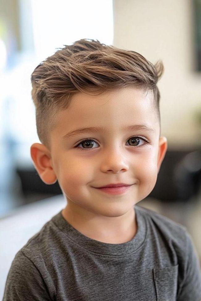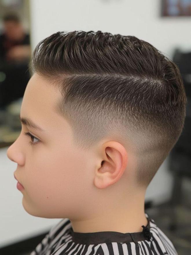 从实用性来说,夏季能有效散热,避免孩子因头发闷热而烦躁;从造型感来看,顶部保留的头发长度为创意造型提供了充足空间。比如可将顶部头发向一侧梳理,用发蜡抓出纹理感,打造“侧分轻熟风”,适合性格偏稳重的男孩,在家庭聚会、儿童礼仪活动中尽显小小绅士的儒雅;也可将顶部头发抓成蓬松的“微分碎发”,搭配渐变推边的利落,让孩子在校园里活力四射,运动时也不会因头发凌乱而分心。
