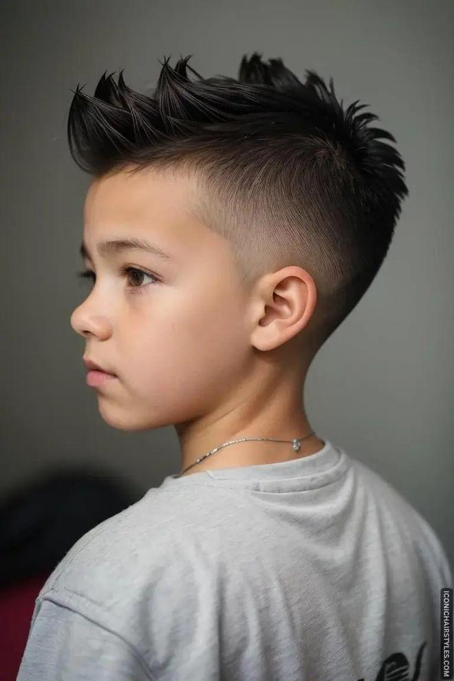 打造这种发型,首先要保证顶部头发有足够的长度来支撑造型,通常需要3-5厘米的发长。其次,定型产品的选择至关重要——硬度高、持久力强的发胶是首选,将头发逆着生长方向抓出尖锐感,再均匀喷洒发胶定型,便能打造出图中极具冲击力的效果。这种发型适合性格外向、喜欢尝试新鲜事物的男孩,无论是参加儿童潮流派对,还是拍摄个性写真,都能让孩子在人群中脱颖而出,成为时尚感满满的“酷仔”。